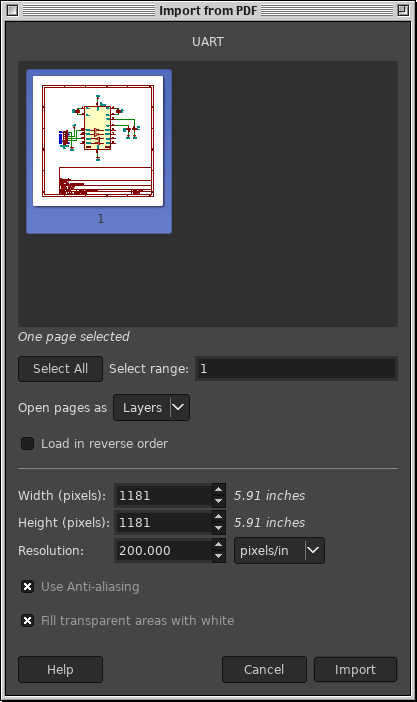 Then GIMP's "Import from PDF" dialog will open for each file. GIMP import each page as a rasterized (pixelated) image. You can set the desired import resolution (in pixels/in, etc) here. Luckily, it will remember the settings from the first file, so you don't have to enter them for each page.