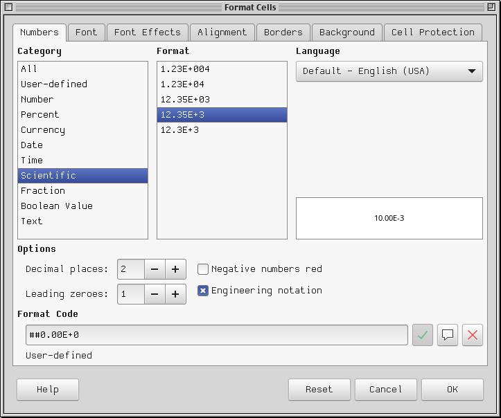 This format code also works in Excel, even though there is no "Engineering notation" checkbox for it.